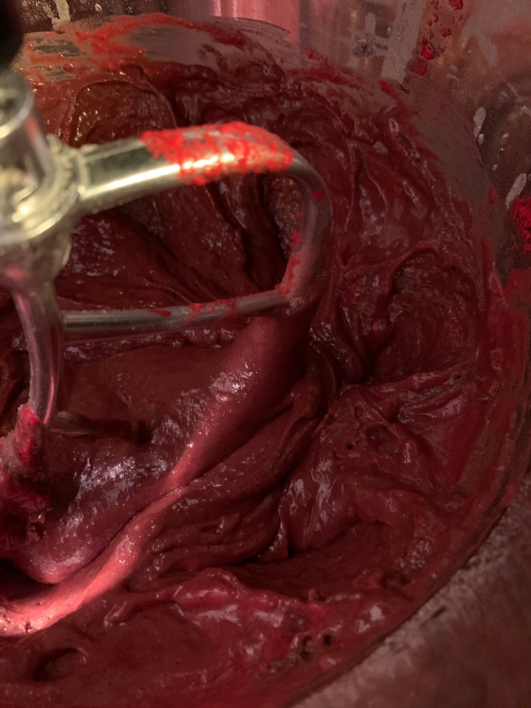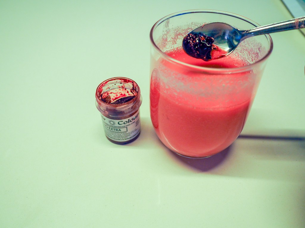 En el red velvet, en la parte de colorear, para que quede bien teñido todo el bizcocho, añado el colorante en pasta a la buttermilk porque es el ultimo proceso y al ser liquido es mucho más fácil disolverlo.